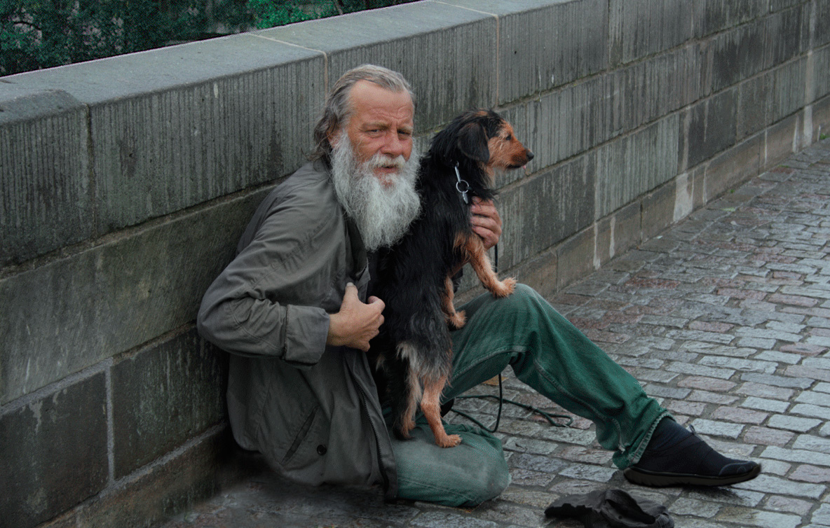 Im unteren Bild herzerweichend wie die enge Bindung zum Hund im Bild deutlich wird. Aber auch dies Bild wirkt "falsch", ein Wohlstandsobdachloser? Mit gekämmten Haaren, blitzenden Schuhen, Leine für den Hund, selbst der Pizzakarton nigelnagelneu und auch sonst überhaupt keine Verwahrlosung? Seltsam alles.