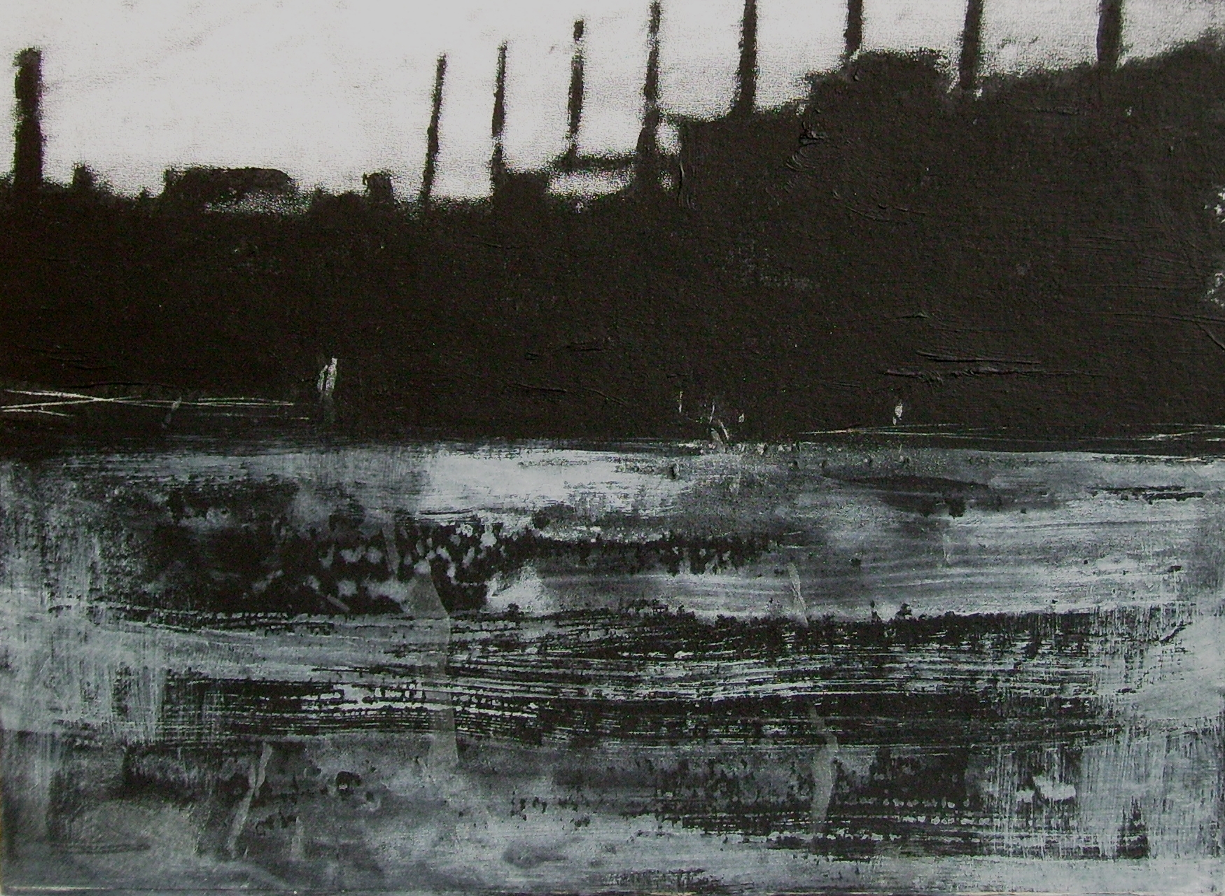an deinem Bild faszinieren mich vor allem die reliefartigen Strukturen und dieses "Widerspenstige", einmal in der unteren Hälfte (da ist eine starke, widerborstige Bewegung drin, vor allem durch die kratzigen Flächen) und zum anderen der Kontrast zum oberen Teil, der eher statisch auf mich wirkt. Es ist für mich fast so, als wolle der untere, sehr bewegte Bereich, dem oberen - in seiner "Gegenbewegung" - Paroli bieten.