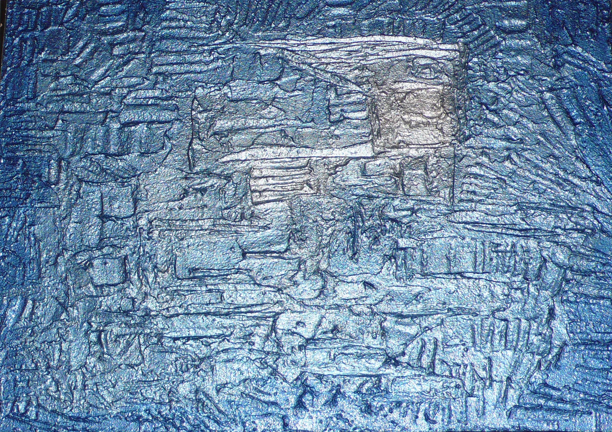 Diese Struktur hier habe ich mit kg-weise feinem Vogelsand, vermischt mit Acrylfarbe hergestellt und einer großen Spachtel in zwei Schichten aufgetragen, als Grundlage. Danach kamen erst die Blei- und Preußisch-Blau-Mischungen drauf.