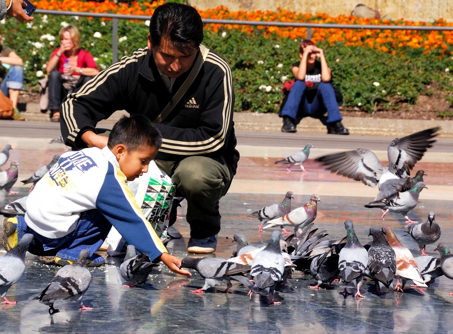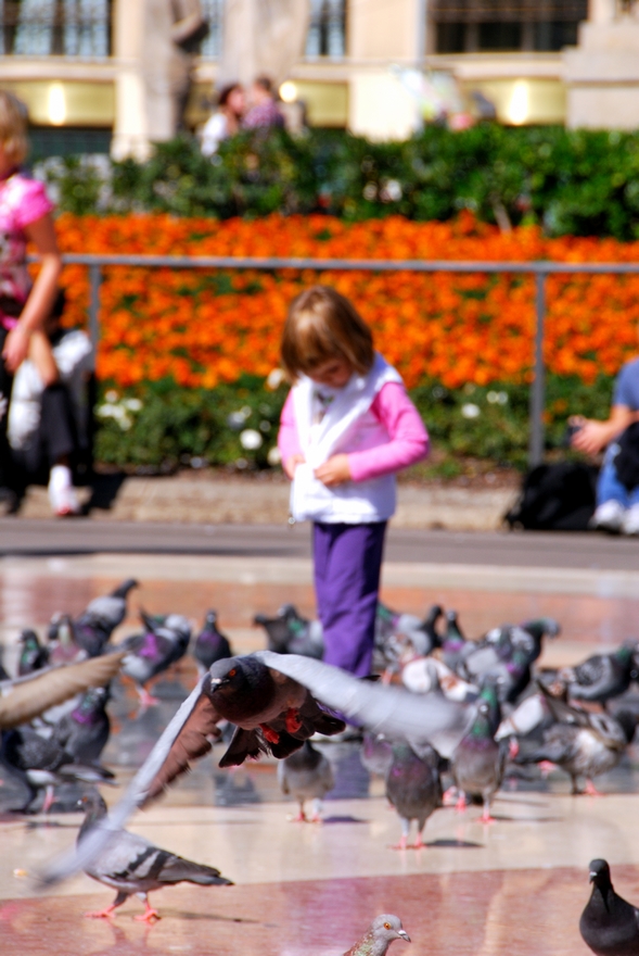 Taubenfüttern vor abgezirkelten Rabatten: irgendwie schon altmodisch (da verboten - jaja, die Ratten der Lüfte -), fast mit Gemälde-Charakter.