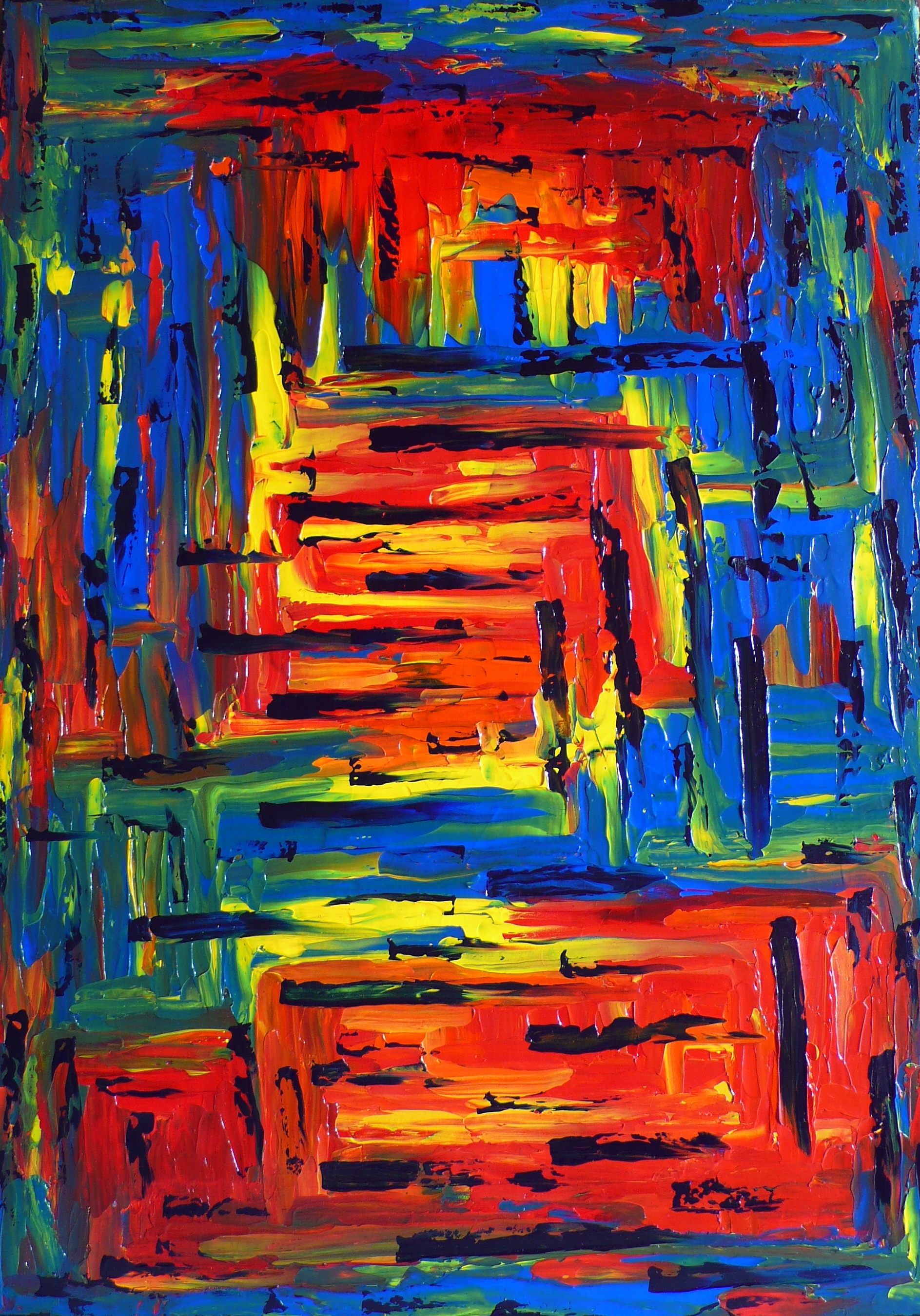 danke für eure Eindrücke! Die Farben des "Indian Summer" dienten mir hier als Inspiration, daher der Titel. Die Balken könnten Baumstämme sein, ja. Es könnten auch angedeutete Fenster oder etwas Ähnliches sein, als blicke man hinaus in diese Farbenwelt. Abstrakt halt. ,-)