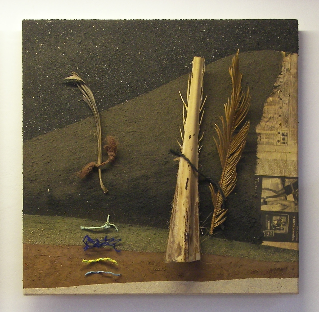 Naturpigmente und getrocknetes Moos auf Grobspanplatte