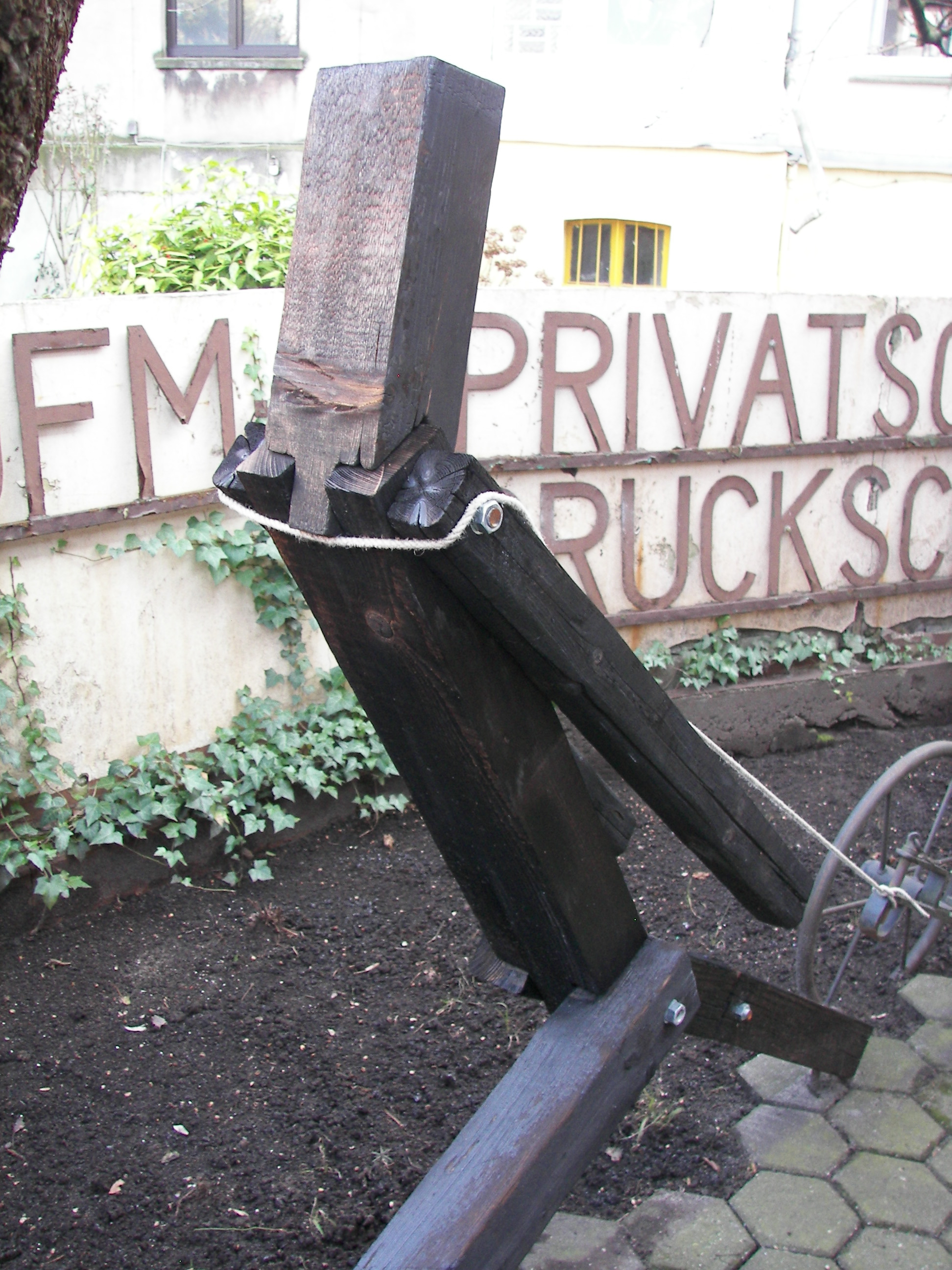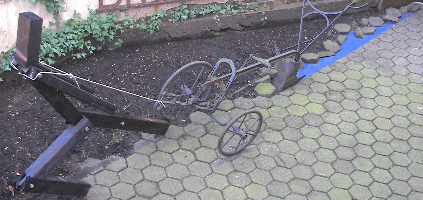 (gezapft und mit Gewindestange verschraubt), historischer Pflug, Betonpflaster, pigmentierter Beton, Erde.
