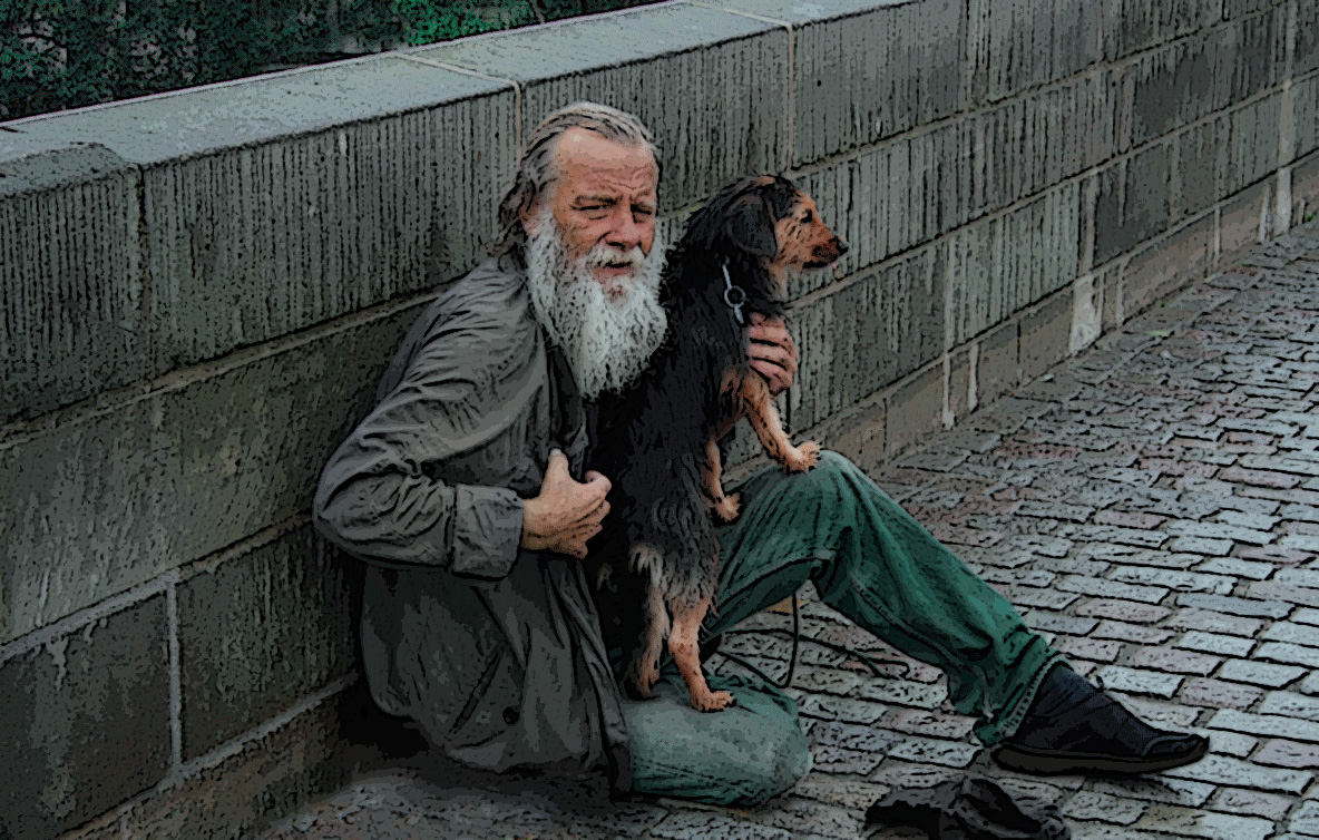 Im unteren Bild herzerweichend wie die enge Bindung zum Hund im Bild deutlich wird. Aber auch dies Bild wirkt "falsch", ein Wohlstandsobdachloser? Mit gekämmten Haaren, blitzenden Schuhen, Leine für den Hund, selbst der Pizzakarton nigelnagelneu und auch sonst überhaupt keine Verwahrlosung? Seltsam alles.
