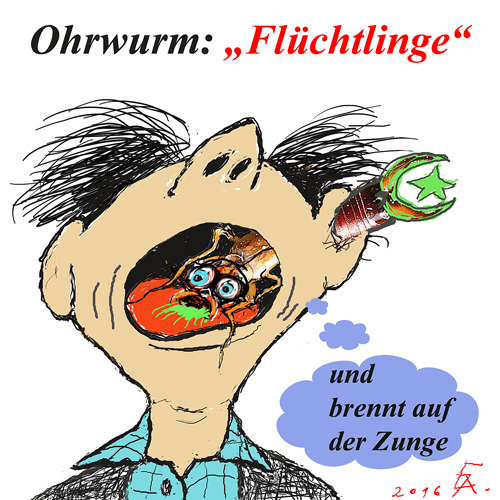 Das Wort Flüchtlinge klingt mir mittlerweile in den Ohren; stellt man morgens das Autoradio an, abends den Fernseher, überall tönt es „Flüchtlinge“. So etwas kann man im übertragenen Sinne einen Ohrwurm nennen, der hartnäckig nachhallen kann. Zudem, alle Leute (einschließlich mich)ringsum gebrauchen das Wort: Es „brennt“ einen auf der Zunge. Sogar nach Feierabend im Smoking verfolgt es einen. Ja, gut, ich könnte dem Herren auch ein kariertes Freizeithemd verpassen; würde vielleicht weniger irritieren.