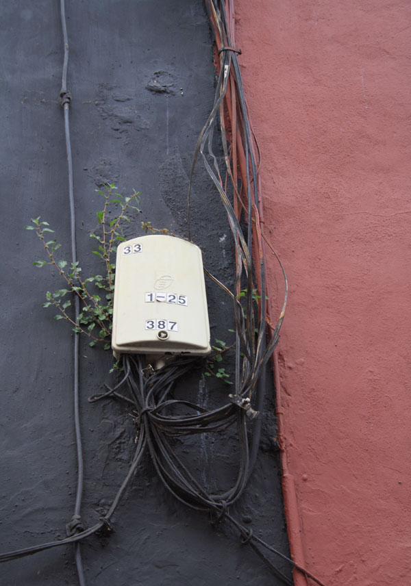 das zweite bild ist einfach so. in einem wandriss hat sich diese pflanze angesiedelt und überlebt offensichtlich in beton und elektrik und schafft zumindest für mich einen ästhetischen reiz, indem sie mit den kabeln und der wand eine einheit zu bilden scheint. sie lebt von sonne und dem wasser aus der luft. sie wird die wand und elektrik und die zivilsition zerstören, wenn man sie nicht entfernt. .....