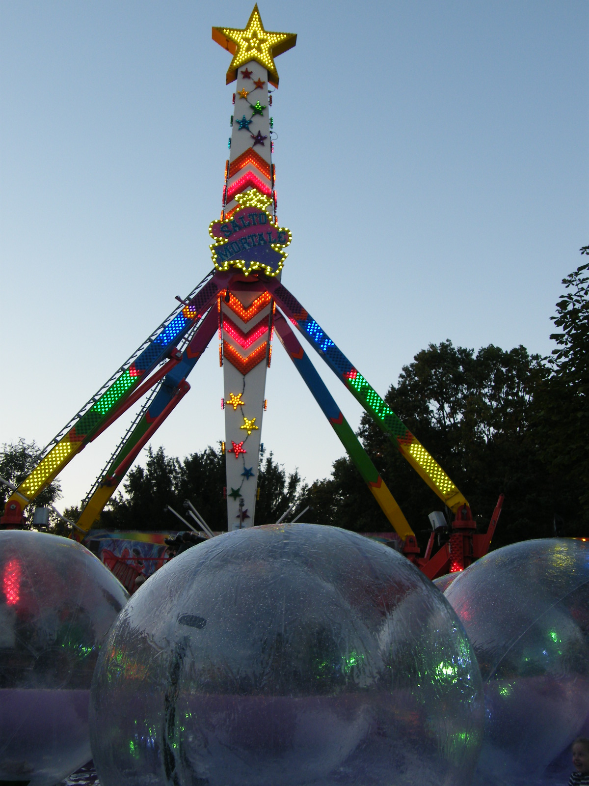 Das ist aufgenommen auf der sog. Fliegenkirmes. In diesen Riesenballons (s.u.) können Kinder sich auf einer Wasserfläche hin und her bewegen. Hatte ich so auch noch nie gesehen. Und direkt dahinter stand eben irgendsoein Überschlagcurrywurstbröckchenverteilfahrgeschäft. :smile: