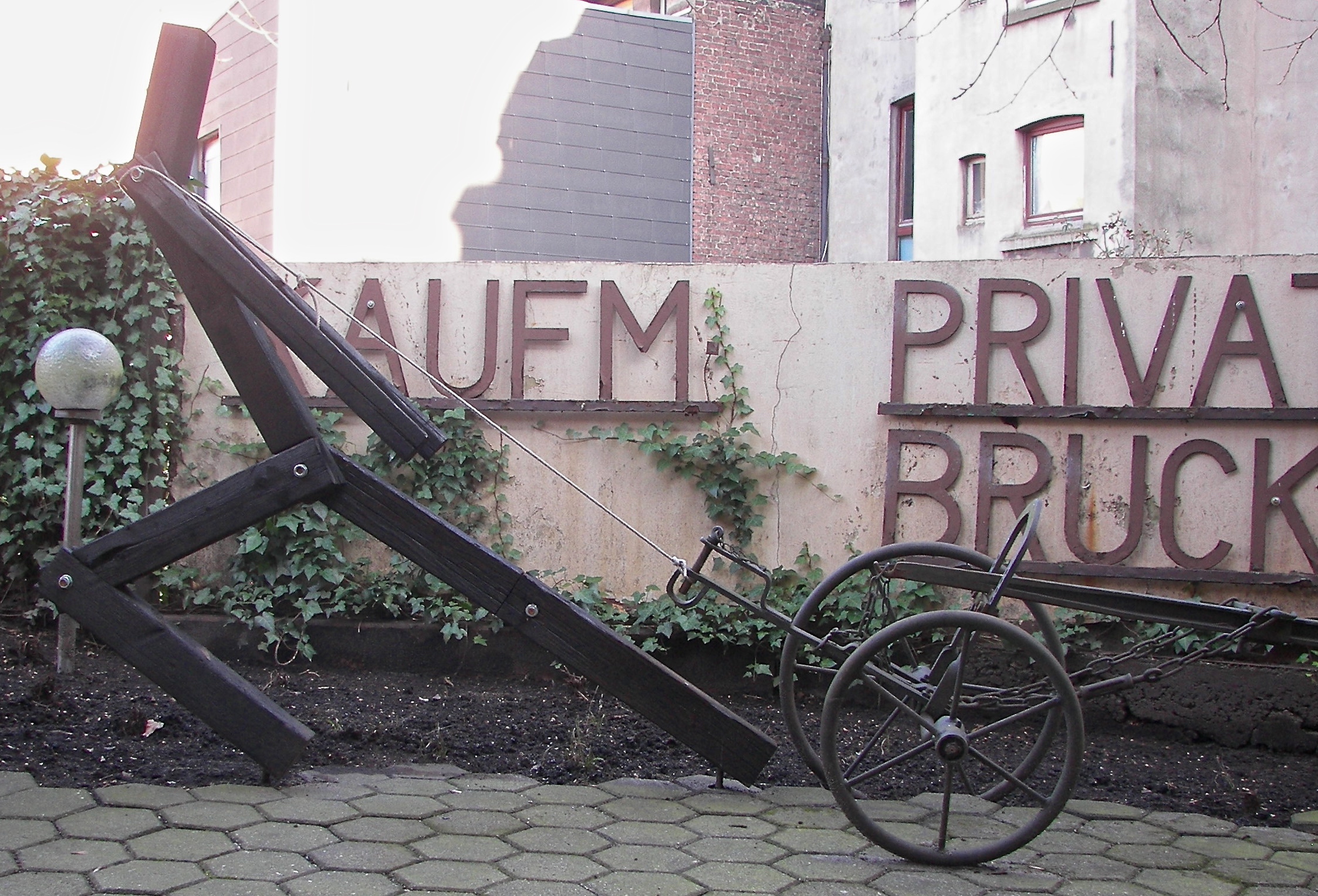 Installation mit historischem Pflug und lebensgroßer Holzfigur auf dem Hinterhof der ehemaligen "Kaufmännischen Privatschule Bruckschen" Duisburg Meiderich,