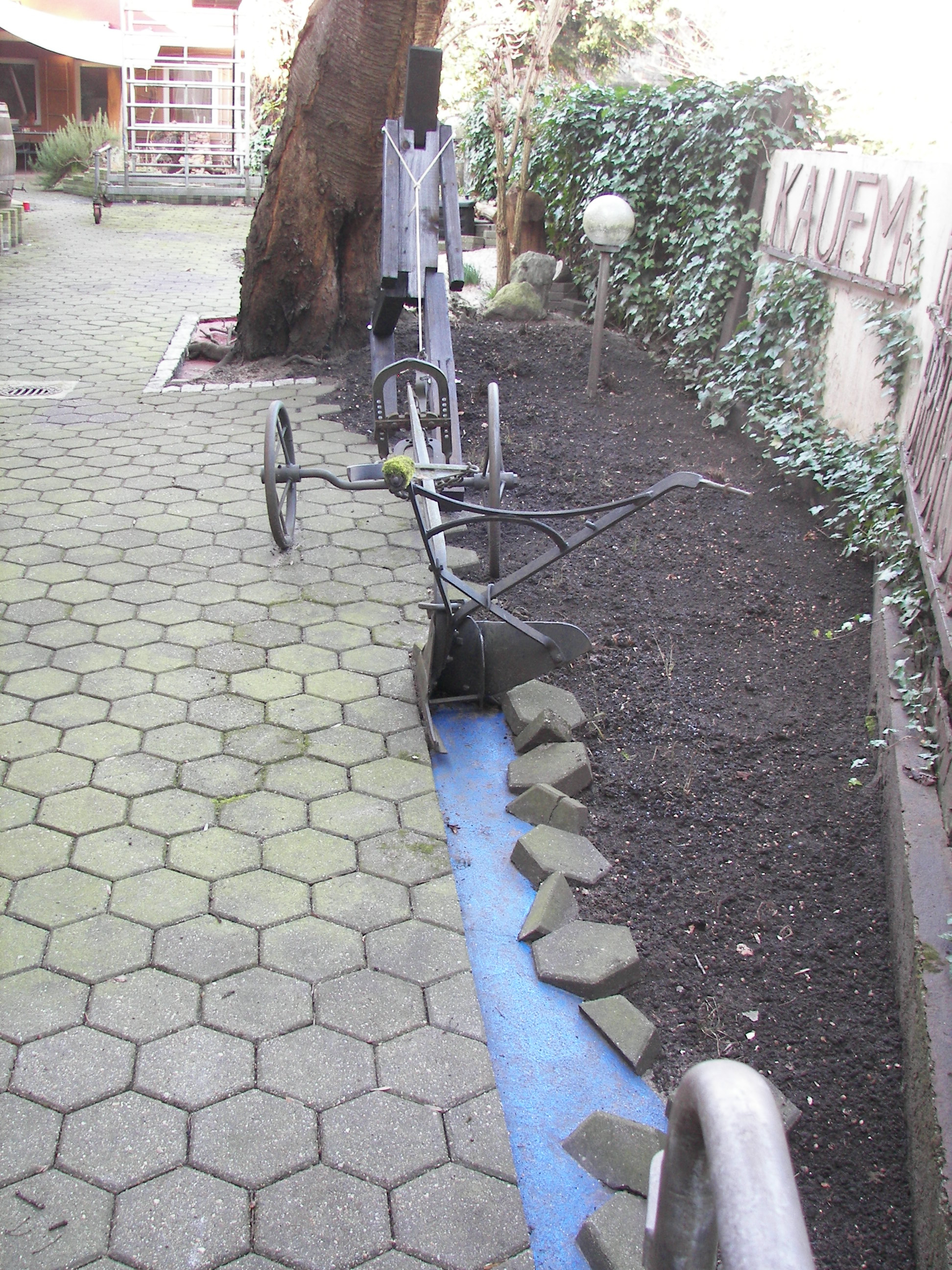 (gezapft und mit Gewindestange verschraubt), historischer Pflug, Betonpflaster, pigmentierter Beton, Erde.