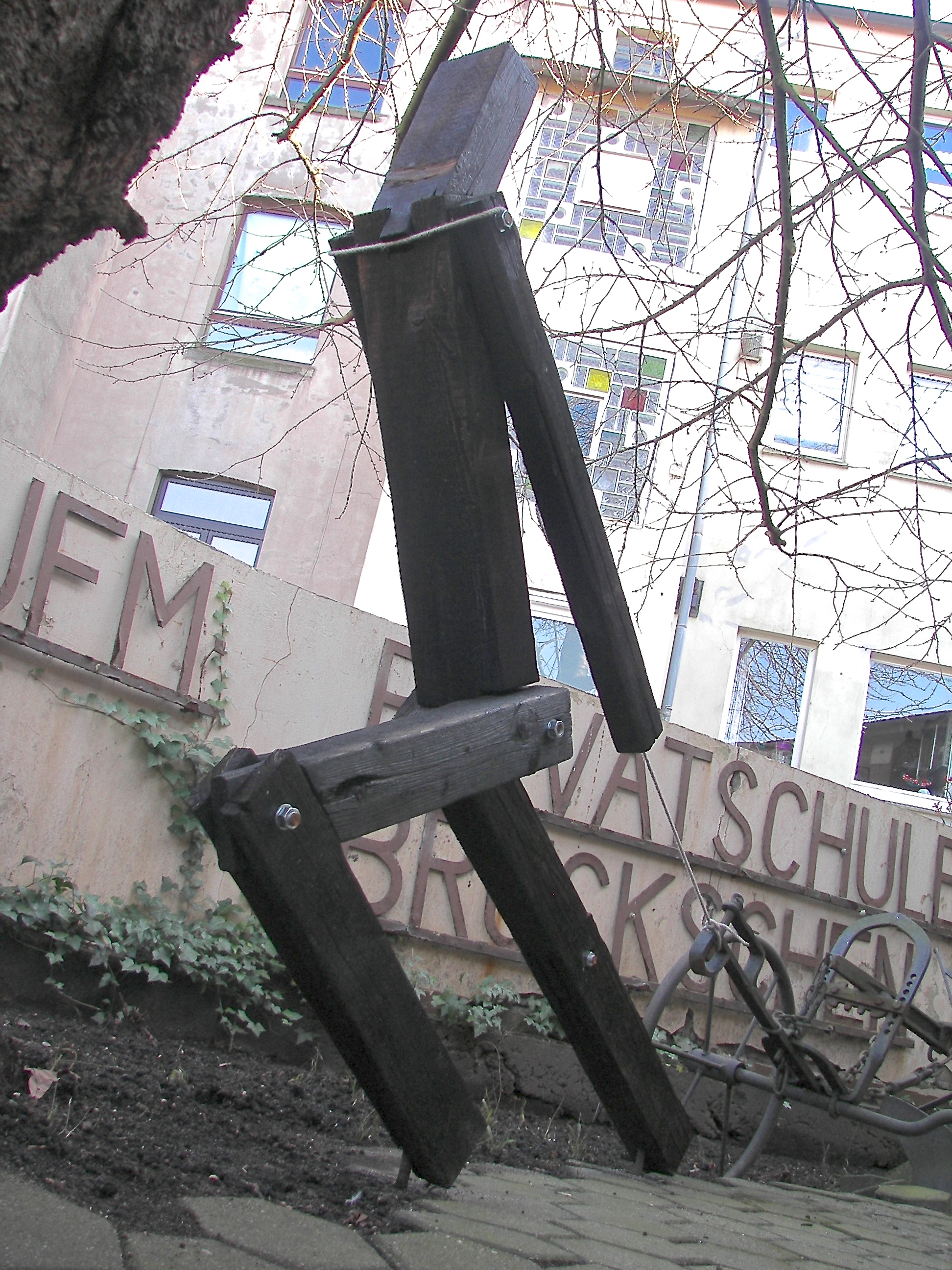 Holzfigur aus historischen Balken vom Rückbau der ehemaligen "Malerwerkstatt Tack" auf demselben Hinterhof von 1898,