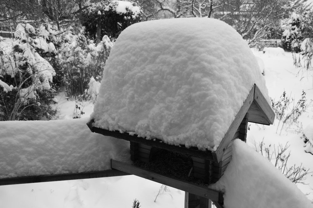 Jeden Morgen, in aller Frühe, füllt sie das Vogelhäuschen auf's Neue. Große Sonnenblumenkerne und Mischungen aus diversen Samen schüttelt sie ins Innere. Sobald sie einige Meisenknödel aufgehängt hat, geht sie leise ins Haus. Nach kurzer Zeit wird es laut draußen. Von allen Seiten, als hätten sie gewartet, fallen Krähen, Meisen, Spatzen und andere Vögel über die reichliche Nahrung her. Kein Krieg. Für jeden ist etwas dabei. Nach einer Weile huscht ein Eichhörnchen dazu und setzt sich unter das Häuschen. Geduldigt wartet es, bis zu grobe Samen zu Boden fallen, füllt sich die Backen und verschwindet.