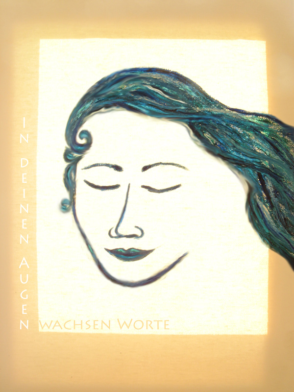 ich finds super! sieht wie ein "richtiges kunstwerk" aus, gefällt mir sehr gut. diese glitzernden, meeresblauen haare und konturen und lippen - sehr fein. man kann etwas erahnen, hat freiraum für eigene assoziationen und wird durch den text in eine angenehme, unterstützende richtung gelenkt. also, ich finde es passt genau so zusammen wie du es hier anbietest :), sehr schön.