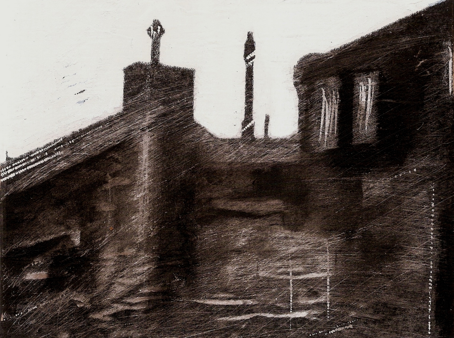 Ja, interessantes Werk. Was Pjotr als Schneetreiben deutet, sind für mich eher Schraffuren, die an Ausstreichungen erinnern. Merkwürdig die Mischung aus Wohn- und Industriearchitektur, unauflösbar. Als Fan von Bernd und Hilla Becher wüsste ich gern, was das ist. Sie legen den Zweck, die Funktion immer offen. Hier wird ein Rätsel draus gemacht. Was verbirgt sich hinter den zwei Fenstern oben rechts? Trotzige Wohngemütlichkeit? Ein Büro? Verlassene Räume?