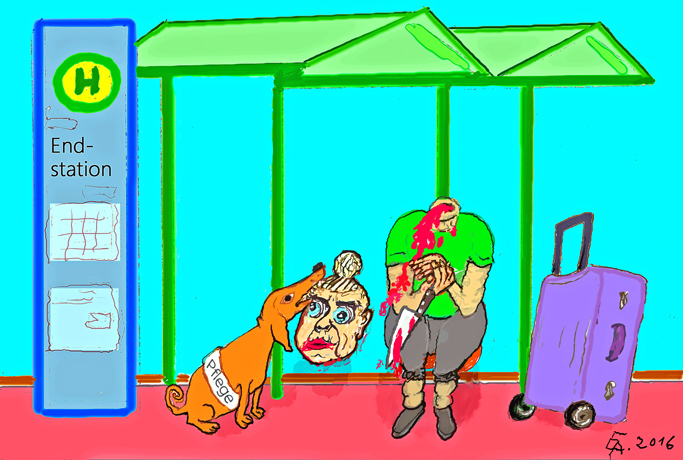 Hm, ich kann mich mit dem Typ nicht identifizieren, aber gut, ich bin auch nicht situiert, auf mich wirkt das Ganze unangenehm, vor allem, weil die Stämmigkeit (Mond, Sichel, Stern) dieselbe Farbe wie die Kotze hat - es sind ja nicht die Flüchtlinge, die kotzen, sondern das Ohrwurmartige daran, ja, gut, es gehört zu dem Ohrenkneifer, trotzdem -- die Abneigung, das Brennen auf der Zunge usw. kann ich erahnen, aber das geht bestimmt weg, wenn der Herr da auf dem Bild mal das Radio und den Fernseher ausstellt und was tut statt was zu hören. Will sagen: Das Bild drückt vielleicht einen Zustand aus, der existent ist, aber vermeidungswürdig und das nicht, weil es den Herren da nervt und brennt, sondern weil er ihn selbst ändern kann.