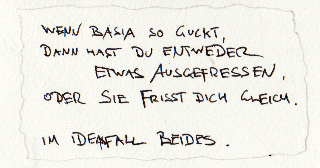 Liegt wahrscheinlich daran, dass das Photo von jemand anderem gemacht wurde (vermutlich nicht unbedingt gewünscht), und die Zeichnung von mir. Ich weiß halt, wie sie aussieht, wenn sie etwas mag ... ist nur so eine Nuance, die sich zur Arroganz dazu gesellt.